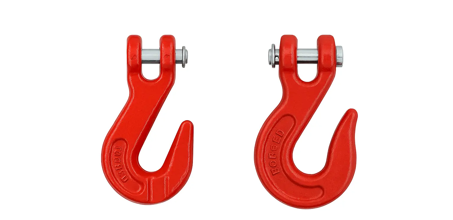 A clevis hook is a heavy-duty hook designed for secure and reliable connection to chains, making it ideal for lifting, lashing, and load-binding applications.
